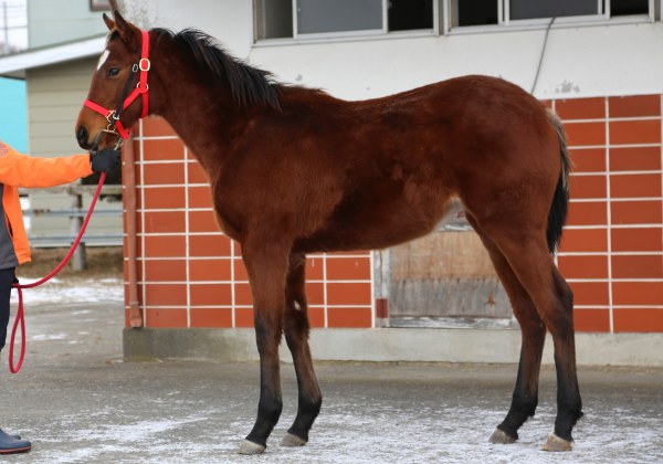 2月中旬現在、米田牧場分場で午前8時30分~翌朝5時迄の昼夜放牧が牝馬5頭で行われている。米田専務は「体重もあまり変化がなかったように、目に見えて変わったところはないですが、1歳1月末で350キロ台なら標準以上で不足のない成長ぶりだと思います。ゆったり大きく歩けており、放牧地で走る姿を見ても、手先を大きく伸長させてフットワークが大きく、一瞬の切れと言うよりも脚を長く使うタイプになりそうです」とのこと。身体つきや血統もだが、気性も落ち着いており、将来は中距離辺りで良さが出る馬になりそうだ。1月25日の馬体重は355キロ。