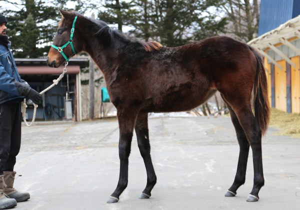 2月中旬現在、丸幸小林牧場で朝6時から放牧して、午後3時に収牧する日中放牧が行われている。スタッフは「牧場のある杵臼地区は、BTCのある西舎とは車で10分程の距離ですが、冷え込みが厳しいと言われる西舎よりも、大抵さらに5℃は気温が低いくらいの場所です。そんな中、毎日、元気で、風邪ひとつひくことなく、バランスの良い馬体のまま順調に大きくなってきています。放牧地の様子を見ると、手先が軽くてバネのある動きをしています。母系の良さがよく出ていると思います」とのことだ。2月17日の体高147cm、胸囲161cm、管囲18cm、馬体重は322キロ。